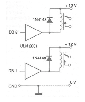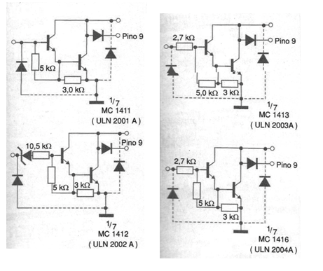 The integrated circuits of the ULN2001 / 2/3/4 series also known as MC1411 / 12/13/14 consist of Drivers that can provide up to 500 mA output for direct control of loads from digital signal inputs. The four circuits are differentiated by the internal configuration of their Darlington transistors, as shown in figure.