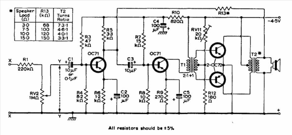 This circuit is powered by a voltage of 4.5 V, being common in radios of the 60's. The circuit is from Mullard's transistors reference manual.