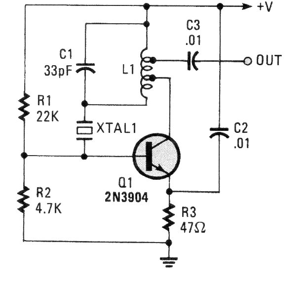This circuit can generate signals up to a few tens of megahertz depending on the frequency of the crystal. The coil depends on the frequency. For 1 MHz, for example, wrap 100 turns of wire 28 in the form of 1.5 cm without core with plugs on the 30th and 60th turn. The transistor can be a BC548 and C1 can have values between 33 pF and 470 pF.