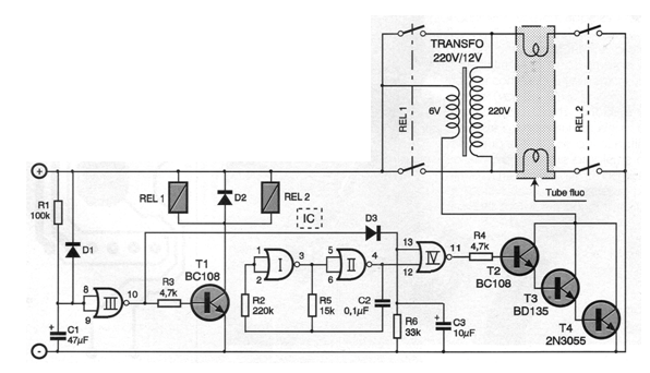 This sophisticated inverter circuit of excellent performance was found in a French publication in 1995. The circuit uses a common transformer and should be used with fluorescents that have 6 V filaments.