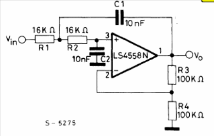 We found this circuit in the 1982 SGS Linear Integrated Circuits manual. The integrated circuit used is a double 741 and the power supply must be symmetrical. The voltage gain is 6 times, and the capacitors can be changed for operation at other frequencies.