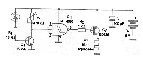 In the figure we have an interesting possibility that consists of the activation of a heating element when the temperature verified by the sensor drops. The trigger point is adjusted in P1. The heating element for the indicated transistor must draw a maximum current of 500 mA. For higher currents, higher power transistors such as the TIP32 or even Darlingtons should be used. The heating element can be a wire resistor of an appropriate value. This value is calculated to obtain heating with the current available in the circuit. For example, we can use a 10 W resistor, generating 8 W of heat.