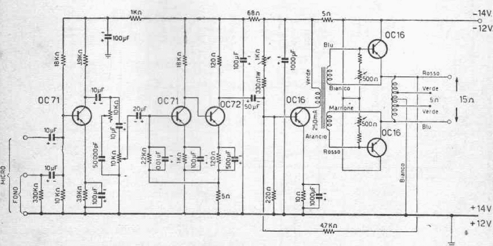 This circuit is from an old Italian publication, using components that are no longer manufactured, but that can be obtained in scrap. The amplifier is intended for use in a car, based on signals from a microphone.