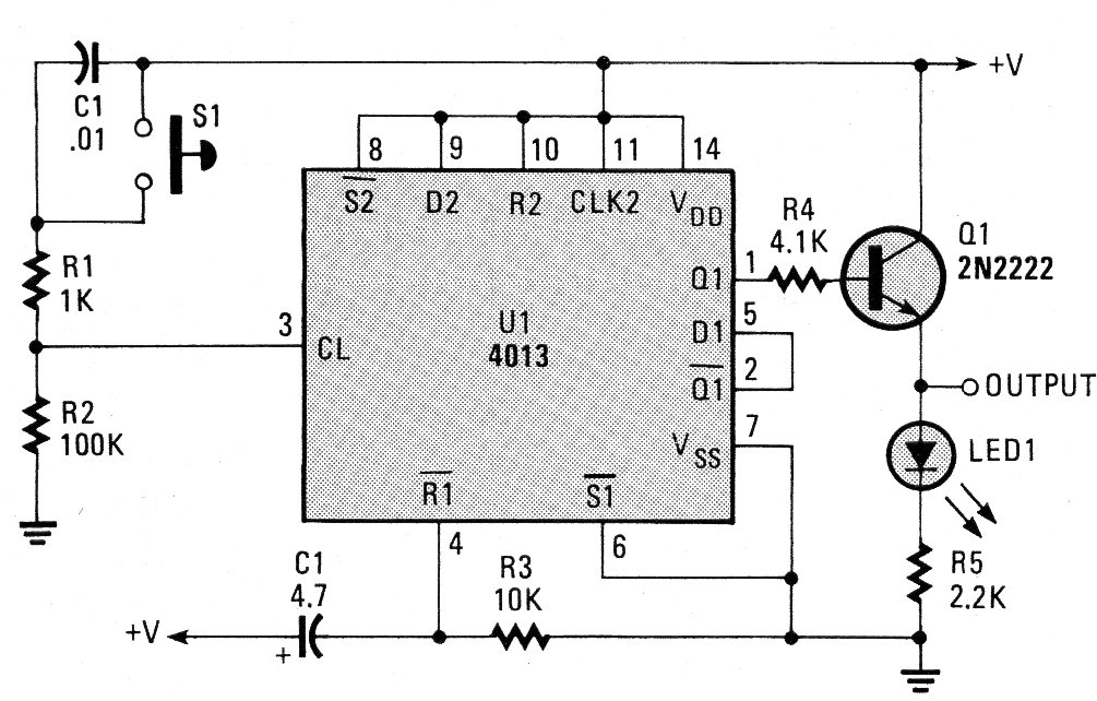 Alternating taps on the pressure switch or sensor, cause the output to alternate the high and low level on this circuit. The output can excite power steps or relays. The 5 to 12 V supply depends on what has been connected to the output. The circuit was found in old American documentation.