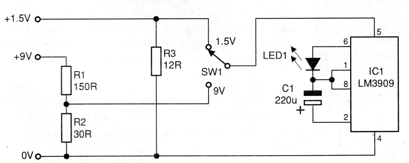 If the battery is good, the LED flashes. This simple tester uses an LM3909 integrated circuit. We found this configuration in an old documentation.