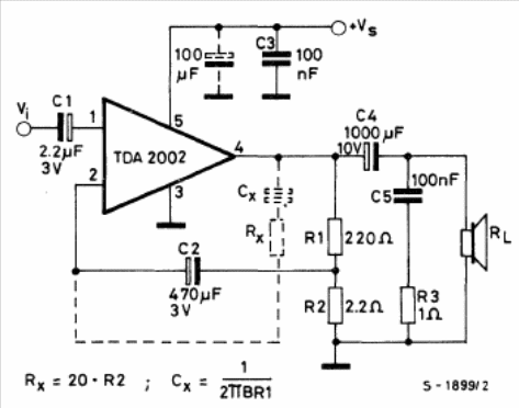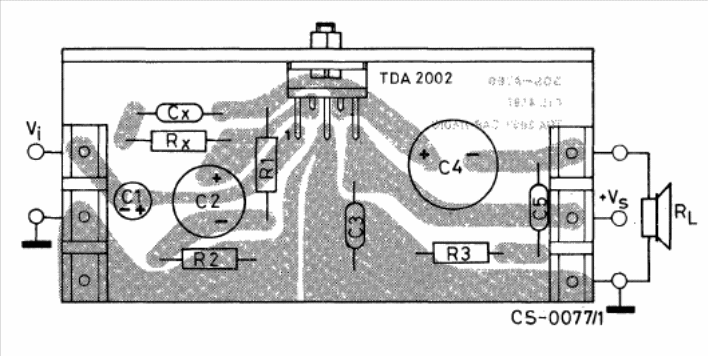 This circuit can be powered by voltages from 8 to 18 V with the output power dependent on this voltage. The integrated circuit must be equipped with a heat radiator. The load can be 2 to 8 ohms. The circuit is from the SGS linear integrated circuits manual. The printed circuit board is given next to the diagram.
