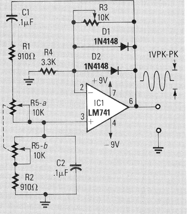 We found this configuration in a Radio Electronics from 1989. The circuit can be designed with other operational amplifiers generating a sinusoidal signal centered at 1 kHz with the indicated components. The power supply must be symmetrical.