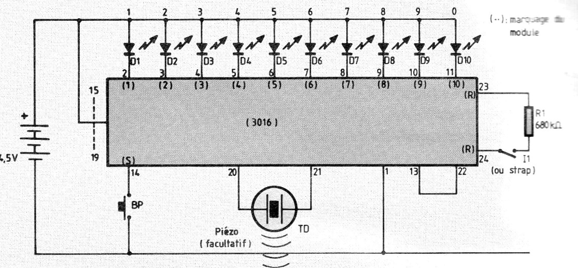 This simple circuit can work with either 4.5 V or 6 or 9 V if a 1k resistor is added in series with the set of LEDs. The circuit is from an old French publication.