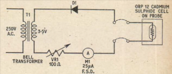 The sensor for this circuit, found in a 1968 magazine is a common LDR. The diode is for general use and the potentiometer, in fact, can have values between 100 ohms and 10k depending on the instrument's full scale and the measured light intensity.