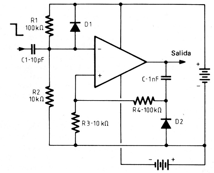 This circuit found in a French documentation from 1982 can be applied to any operator. The duration of the output pulse is determined by the capacitor and the source must be symmetrical between 3 and 12 V, depending on the operational.