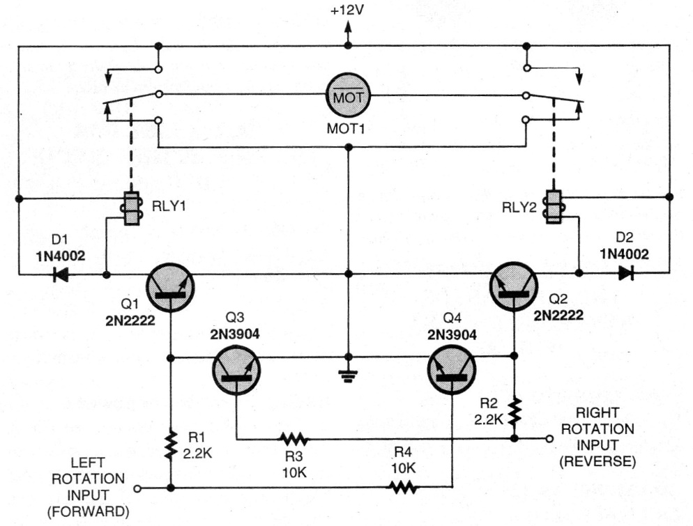 This circuit uses two relays to reverse the direction of rotation of a direct current motor. It can be used in automations and robots. We found this configuration in a Poptronics from the 90s. The relays can be 50 mA x 12 V.