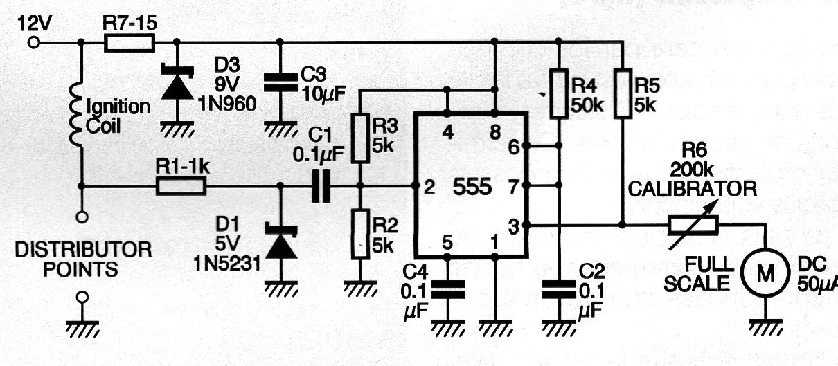 This analog tachometer can be used in cars with platinum or in robotic and automation applications to measure the rotation of a mechanical part, with changes in the values of the components, specifically C2 and R4. The circuit can use the lowest scale of a milliammeter. We found this configuration in a Signetics manual.