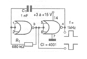 The circuit shown in the figure generates a rectangular signal whose frequency depends on C1. For a 1 nF capacitor, the frequency generated will be of the order of 1 kHz, keeping the other values of the diagram components. Remember that the maximum recommended frequency for this circuit with a 10 V supply is around 7 MHz. See that we can obtain outputs in phase opposition, removing the signals from the outputs of the two gates.