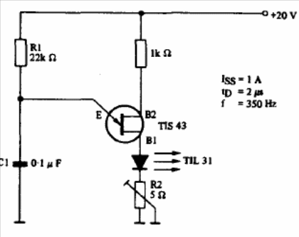 The selected circuit generates short duration pulses at a frequency determined by R1 and C1. The unijunction transistor can be 2N2646 and the intensity and duration of the pulse are adjusted in the trimpot. The circuit is from the Texas Instruments optoelectronics manual.