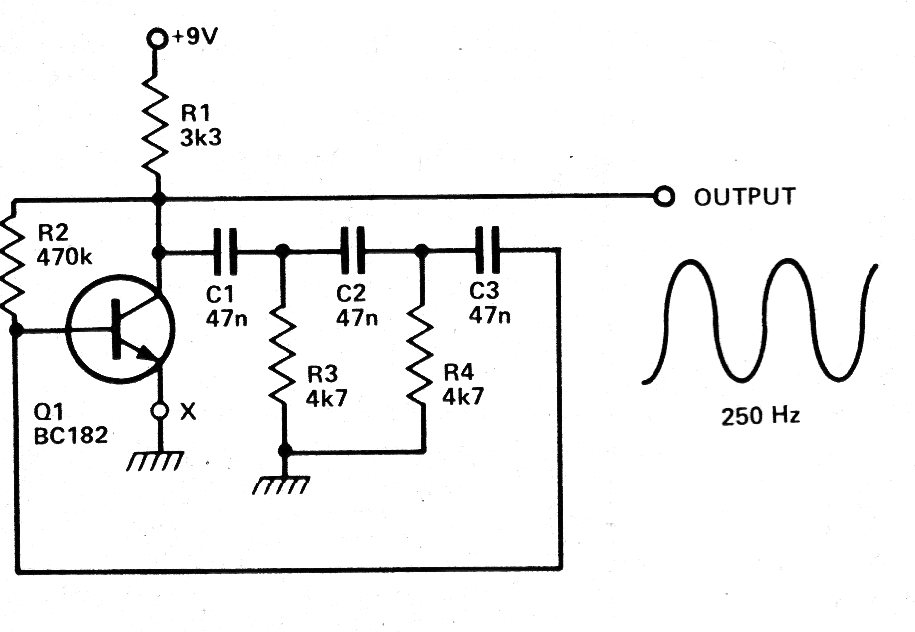 This traditional circuit generates a 200 Hz sinusoidal signal. The frequency depends on the capacitors and the transistor can be a BC548. We found this circuit in a 1979 documentation.