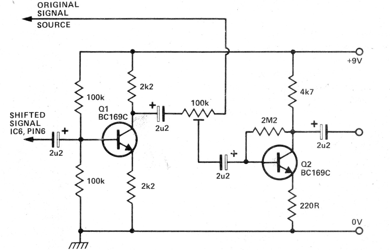 This circuit inverts the phase of an audio signal, maintaining its intensity. The transistors can be BC549 and the circuit is used to excite BTL power steps. We found this configuration in a 1978 documentation.