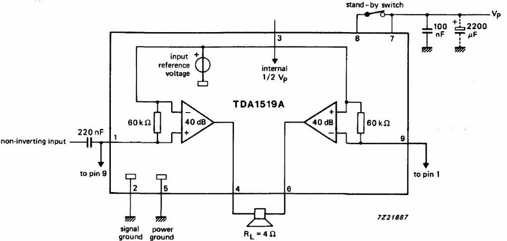 This amplifier is from the Philips Databook of 1990. The circuit is suitable for automotive use and has the characteristics given in the table below the diagram.