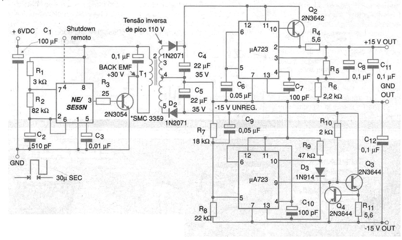The circuit shown in the figure is in fact an excellent symmetrical switching source capable of supplying positive and negative voltages of 15 V from a 5 V input. The 555 functions as a switch that generates the switching frequency for the 2N3054 power transistor. The signal generated has a period of 60 us and the transformer used is special, with a ferrite core with characteristics that allow the voltage rise to 15 Vrms at its output. The rectified voltage of the secondary of the transformer is regulated by integrated circuits 723 with transistors that allow to increase the current. However, the circuit can be modified to operate with other, more modern regulators. This circuit was suggested by Philips in its manual of linear integrated circuits.