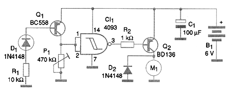 Analyzing the circuit shown in the figure we see that the difference in relation to the previous ones is in the use of a PNP transistor to amplify the current of the sensor element. When the temperature rises, the base current of the transistor increases and with that its resistance decreases. the result is an increase in voltage at the input of the inverter port 4093. When a sufficiently high value for switching is reached, the output goes down and the transistor q2 is polarized to conduct the current. Under these conditions, the motor is powered, providing the desired ventilation for the system. Again, we use a 500mA transistor, but higher current transistors can be used. The adjustment of the trigger point is made in the trimpot P1. The sensor can be any common general-purpose diode. Observe the reader that in all circuits we always use a 10k ohms resistor in series with the sensor diode. This component prevents that, in case of an accidental inversion of the diode at the time of assembly, it is not polarized in the direct direction without any current limitation. This would cause an intense short-circuit current that, passing through the transistor, would cause it to burn.