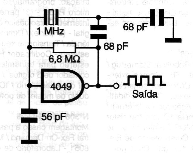 This crystal-controlled oscillator generates a 1 MHz rectangular signal and can be used as a time base for digital instruments, clocks, or stopwatches. The capacitors are ceramic, and the CMOS integrated circuit must be supplied with voltages between 9 and 15 V. Other CMOS functions that operate as inverters can be used instead of 4049.