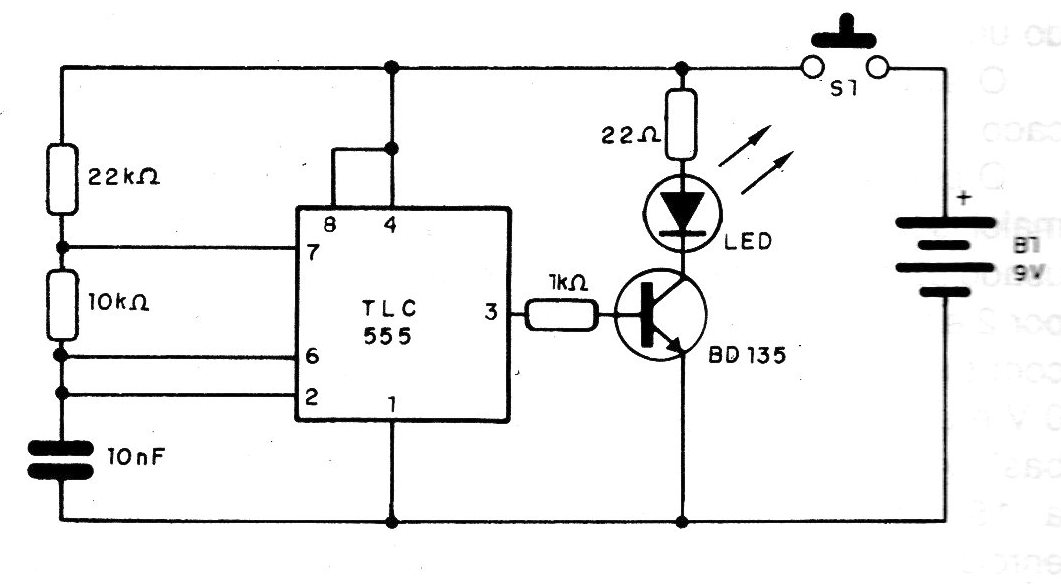 The purpose of this circuit is to 'produce a beam of infrared rays modulated at a frequency that depends on the components next to the 555 and which in the example, is of the order of a few kilohertz. This frequency can be increased up to 100 kHz by exchanging the 10 nF capacitor for a smaller one and the 10 k resistors for others whose minimum value is 1 k ohms. OLED must be of power, with a current of at least 80 mA and the circuit can be supplied with voltages from 3 to 9 V. For continuous operation, the transistor must be equipped with a heat radiator.