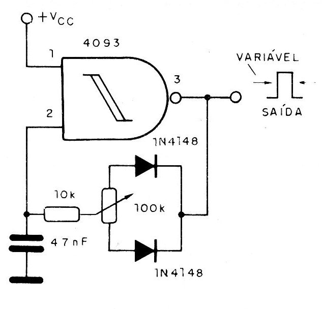 The oscillator shown in the figure keeps its frequency constant in an active cycle adjustment range between close to 0 and 100%. For the components indicated, the circuit will operate in the audio range, around 10 kHz approximately. The capacitor can be changed in the range from 1 nF to 1 pF to obtain other operating frequencies. The exchange of the 1ok resistor for a 100k potentiometer in series with a 4k7 resistor allows the simultaneous adjustment of the frequency, but the active cycle range will be modified.