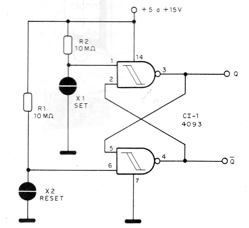 This bistable touch sensitive must not be powered by a source without a transformer. The outputs can excite steps with transistors loaded with relays to control power circuits. Resistors R1 and R2 determine the sensitivity of the circuit.