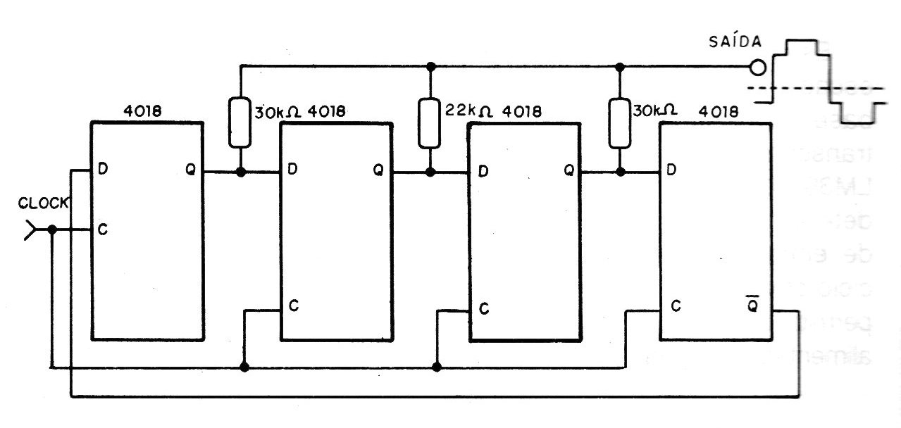 This circuit synthesizes a sinusoidal signal from logic pulses that can be obtained from an oscillator of the same family (CMOS) or even TTL. 4 flip-flops of 2 integrated circuits are used 4018 waveform of the output (shown in the diagram itself) needs filtering to obtain the desired sinusoidal signal. The filtering can be done with an RC network whose component values depend on the frequency of operation.