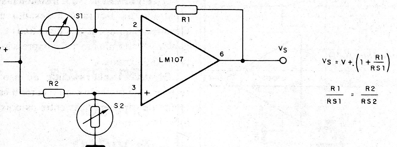 This is a bridged configuration for resistive sensors using an operational amplifier. The circuit is suggested by National Semiconductor and equivalent operational amplifiers can be used. The source must be symmetrical and the formulas next to the diagram relate the values of the components.