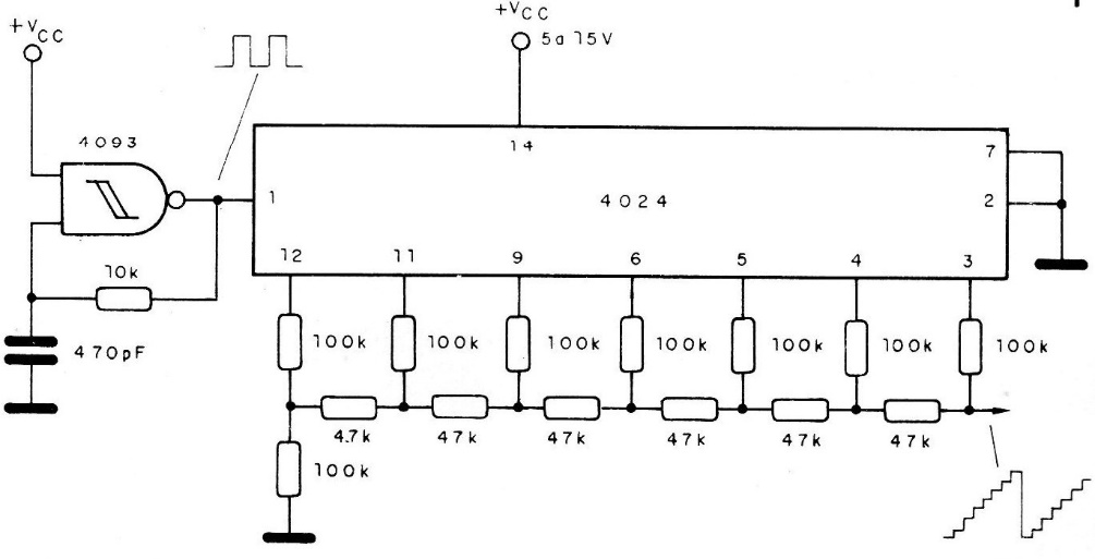 The first circuit, shown in the figure, generates a stepped signal whose frequency depends on the 4093 clock. The frequency, in this case, is divided by the number of steps that are the same width, given by the resistors of the voltage divider system. This circuit can be used in curve plotters, electronic musical instruments and in many other applications. For the oscillator, the frequency is around 100 kHz, but can be changed at will, leaving the capacitor between 220 pF and 1 uF and the resistor typically 4k7 and 1M.