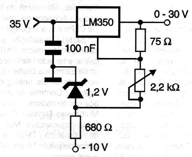 This voltage regulator step can be used for a variable source from 0 to 30 V with a maximum output current of 3 A. The rectifier circuit must deliver high around 33 to 35 V to the regulator for better operation. The 1.2 V zener diode makes it possible to establish a negative voltage reference in order to obtain zero volt for the circuit. Note that it is necessary to have a sector that provides a negative voltage of 10 V for this reference diode. The integrated circuit must be equipped with a suitable heat radiator.