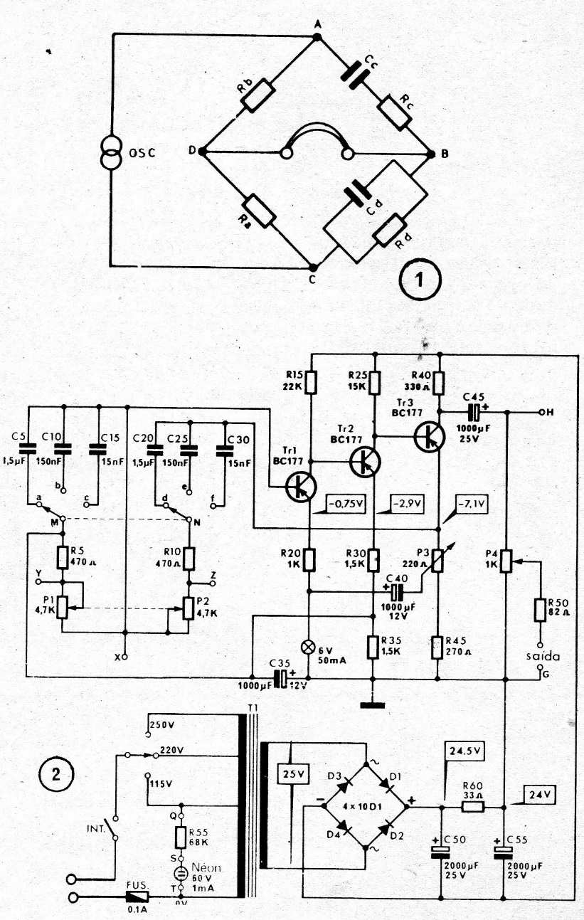 A low frequency or audio frequency generator is an almost indispensable instrument in which it operates in the field of amplifiers and surroundings. The scheme we are going to present is sold in kits by the British firm AMTRON. But, as it does not present its products in Brazil, we do, venia venia, the presentation of the scheme to elucidate our readers. The range of the audio frequency generator is from 15 to 22,000 Hz, in three ranges selectable by the two-pole, three MN positions. The maximum output is 2 effective volts, with a linearity of 1.5 dB and a maximum distortion of 1% at all frequencies. The circuit is classic of a Wien bridge, whose basic principle can be seen in figure 1. This bridge derives from the Wheatstone bridge, which is used for the measurement of capacitors and resistors. We will not give here the theoretical treatment of the functioning of the Wien Bridge, because our interest is to divulge an easy circuit of simple construction, for the bench man or experimenter who wants to build his own instruments. All values are in the diagram in figure 2. The only necessary adjustment, before using the audio-frequency generator, is made through a 220 ohms P3. A voltmeter is placed at the output of the generator, on the scale that allows observing between 1.5 and 3 volts. The selector switch MN is placed in position b and the potentiometer P1-P2 is placed in the position that is equivalent to 1,000 Hz and P3 is adjusted so that the voltage is 2 V.