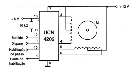 The UCN4202 integrated circuit contains 4 power drivers capable of directly driving a 12 V stepper motor 16. The integrated circuit in the logic part is supplied with a voltage of 5 V, which makes its inputs compatible with TTL or CMOS logic. Note Enabling that it has sense control, triggering and enabling of step and enabling of step.