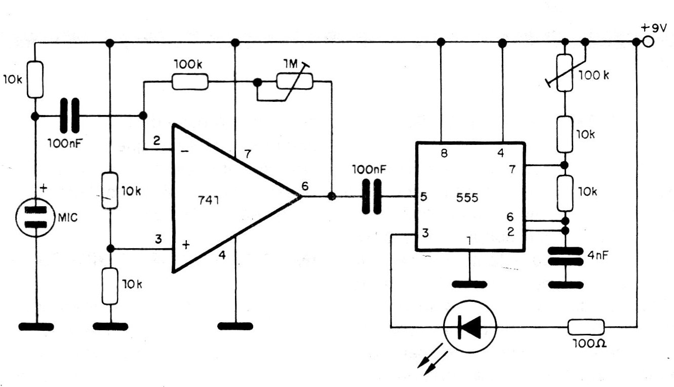 In the figure we have the circuit of a pulse transmitter modulated in frequency (PFM) in the range of 20 to 50 kHz and that serves as an audio link. The 100 ohms resistor in series with the LED can be reduced for greater power depending on the type of emitter used. The transmitter does not need a symmetrical source and the gain in modulation (depth) is adjusted in the 100k trimpot. The transmitter must be chosen according to the designed transmission system.