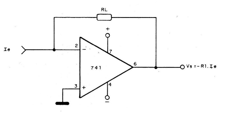 The presented circuit provides an output voltage proportional to the input current, according to the formula given next to the diagram. The basic configuration can be applied with other operational amplifiers and the power supply used must be symmetrical. The input current must be of the order of microamperes, or, for operation with higher currents, a shunt must be used.
