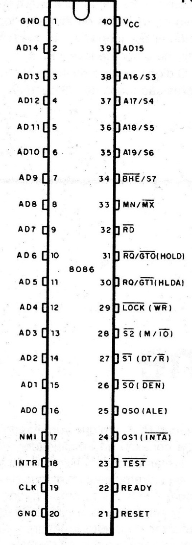In the figure we pin the 8086, Intel's 16-bit microprocessor. It is manufactured according to H-MOS technology, which allows operation with 8MH2 clock. The 8086 chip contains 29,000 transistors in a 40-pin DIL package, as shown in the figure.