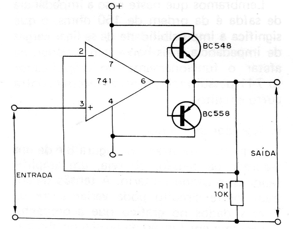 In the figure we have an application in which the input and output voltage are equal, with the difference that the output impedance is reduced to the point where we can have a high current in the load circuit. This current is much higher than that which could be obtained from a simple operational amplifier since its output impedance is in the order of 150 ohms. The output voltage can then vary from -8 to +8 V, following variations in the input voltage with a maximum current of 50 mA. It is important to note that, as the voltage at which the transistors begin to conduct is approximately 0.6 V, in the range from zero to this value, the circuit has a certain hysteresis, that is, there is a deformation of the signal form obtained at the output in relation to the input signal. This fact is important to note if the circuit operates with alternating current signals. The transistors used must have the same characteristics and are, however, complementary.