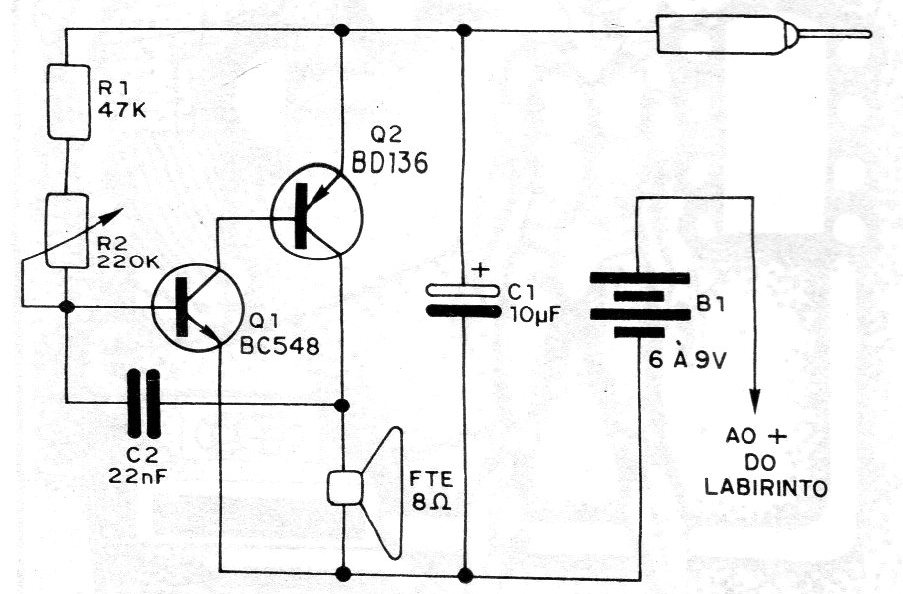 Electronics offers endless possibilities in terms of games. For those who like this type of project, we have a very interesting one here, as it allows "testing" the firmness of the nerves, as suggested by its author. The name given by the author of "Electronic Psychotest" indicates one of the possible applications for the circuit. The purpose of the game is to pass a probe through the tracks of a printed circuit board in the shape of a "labyrinth", in a determined path. The probe can in no way touch the edges of the path, because if this happens a oscillating circuit will be triggered by emitting a strident sound. The emission of this sound indicates “error” and, therefore, the player's disqualification or loss of points. Note that in this game you should have a “double attention”, because while avoiding touching the probes on the trails, you should look for the exit or path that leads to the end of the route.
