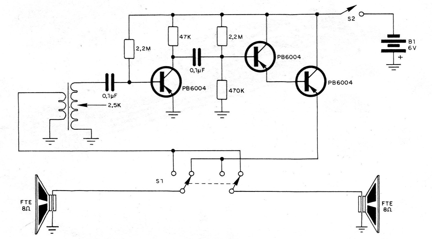 This circuit was found in a 1980 publication. It uses only 3 easily obtainable transistors. It is a two-channel intercom with the two output transistors connected in the Darlington configuration with which a very good output volume and excellent sensitivity are obtained. The power supply must supply a voltage of 6 V and 4 batteries can be used, which will have considerable durability since, according to the author, the consumption of the device is only 20 mA. In view of the system operating at low impedance, the interconnection line does not need to be shielded, but it must not be more than 50 meters in length. The transformer used in this device has a primary winding of 2000 ohms and a secondary winding according to the speaker.