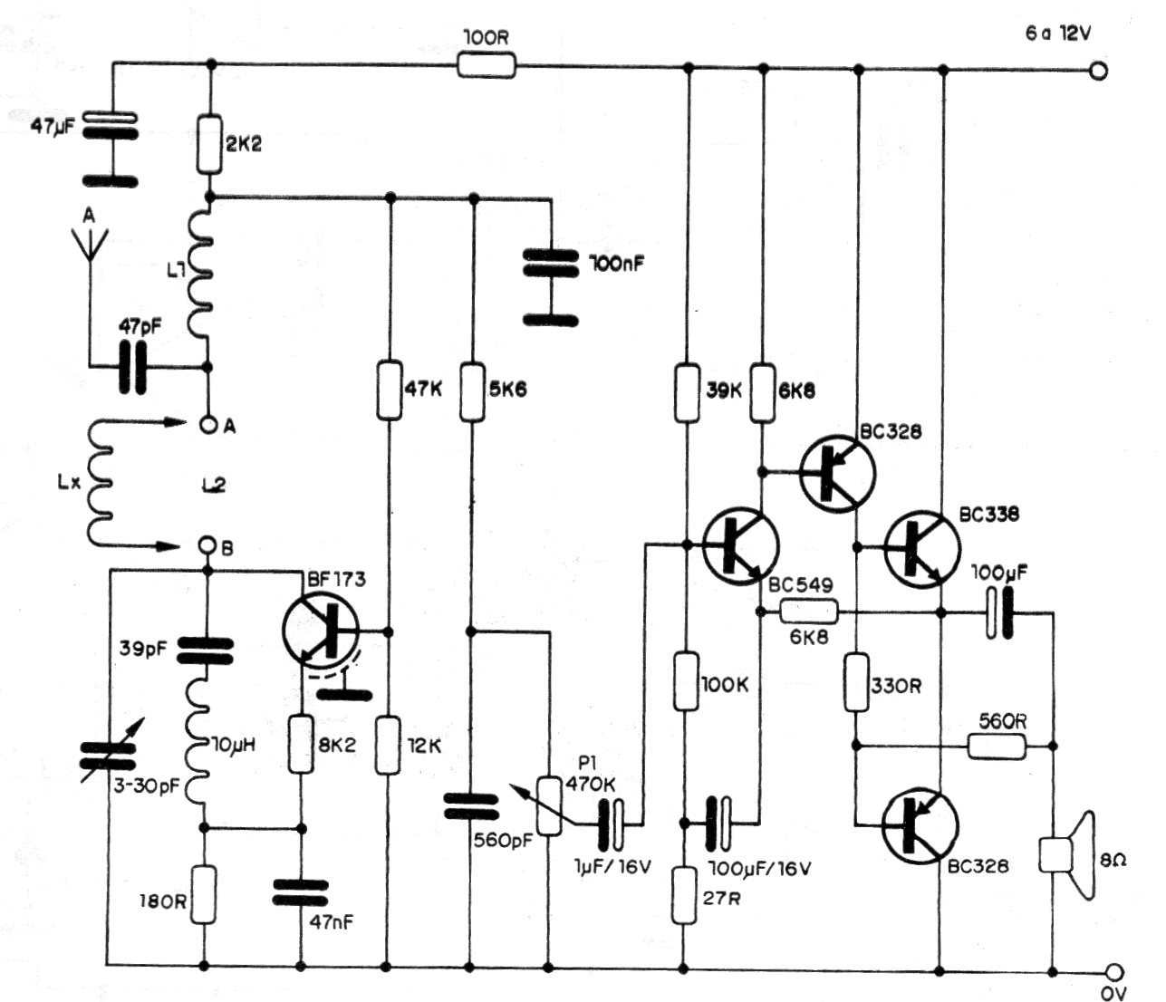 We found this super-regenerative circuit for the short-wave range and VHF in a 1990 documentation. The table indicates the coils for the 4 possible lows. The circuit must be powered by an excellent filtering source and has a good audio amplifier stage. The antenna must be telescopic up to 120 cm in length.