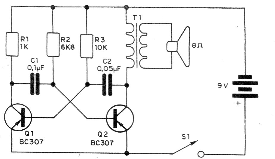 We have a simple and useful circuit found in a 1982 documentation which generates a signal in the audible range. It is an astable multivibrator whose frequency is basically determined by capacitors C1 and C2 and which can be used in alarms, call systems, toys, etc. The resistor R3 can be connected in series with a 47k potentiometer, in which case we will have added one to the circuit. tone, or frequency control. By changing the capacitors to values above 1 uF, the circuit will produce very low frequency signals, becoming a metronome. The output transformer is the type found on transistor radios, with primary impedance between 500 ohms and 2,000 ohms