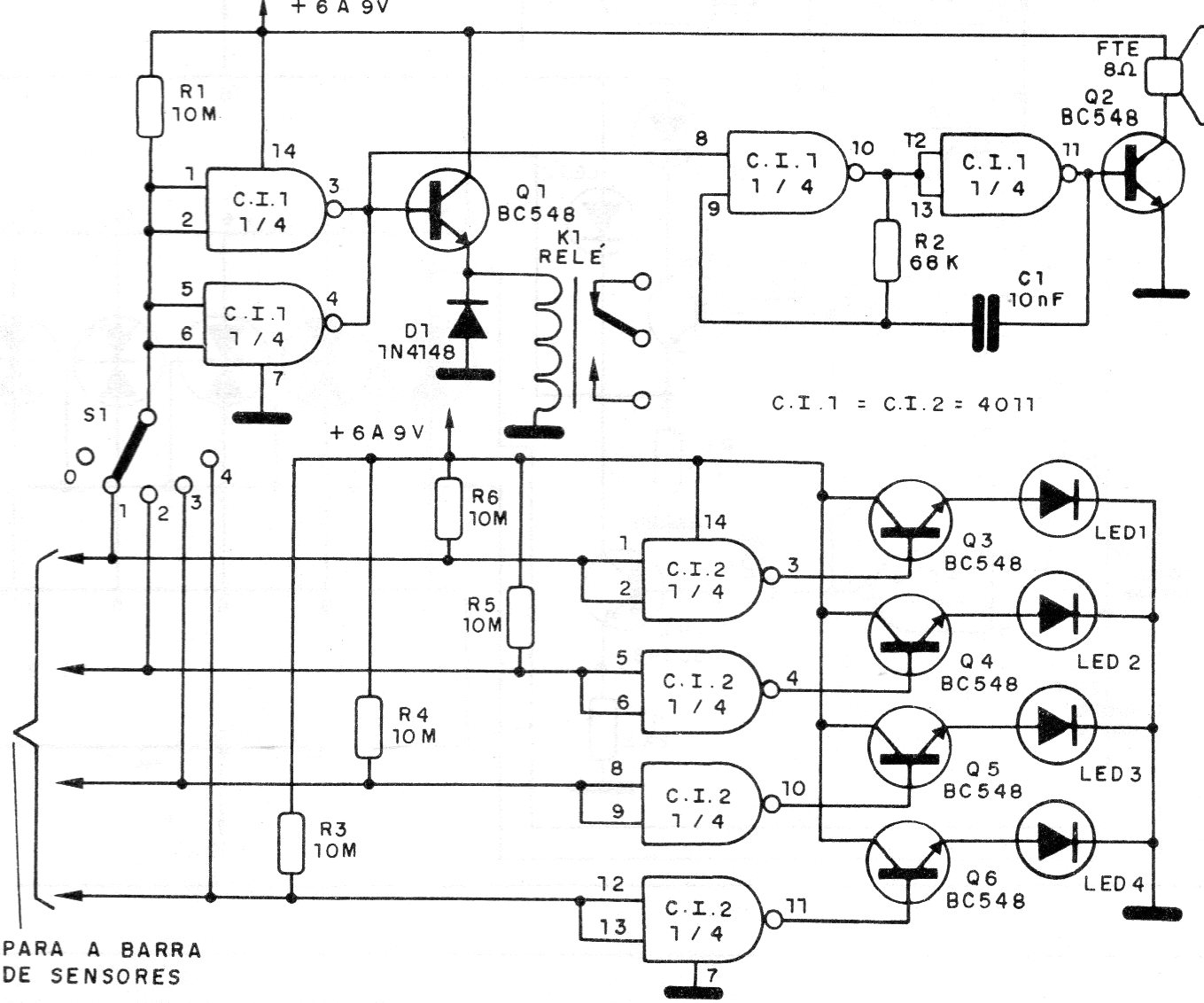 This circuit has a programmable alarm that can be triggered with different water levels. The circuit has 4 warning positions, triggering LEDs. The circuit must not be powered by a source without a transformer and the sensors consist of bars with bare ends to contact water. Never use a source without a transformer to power this circuit.
