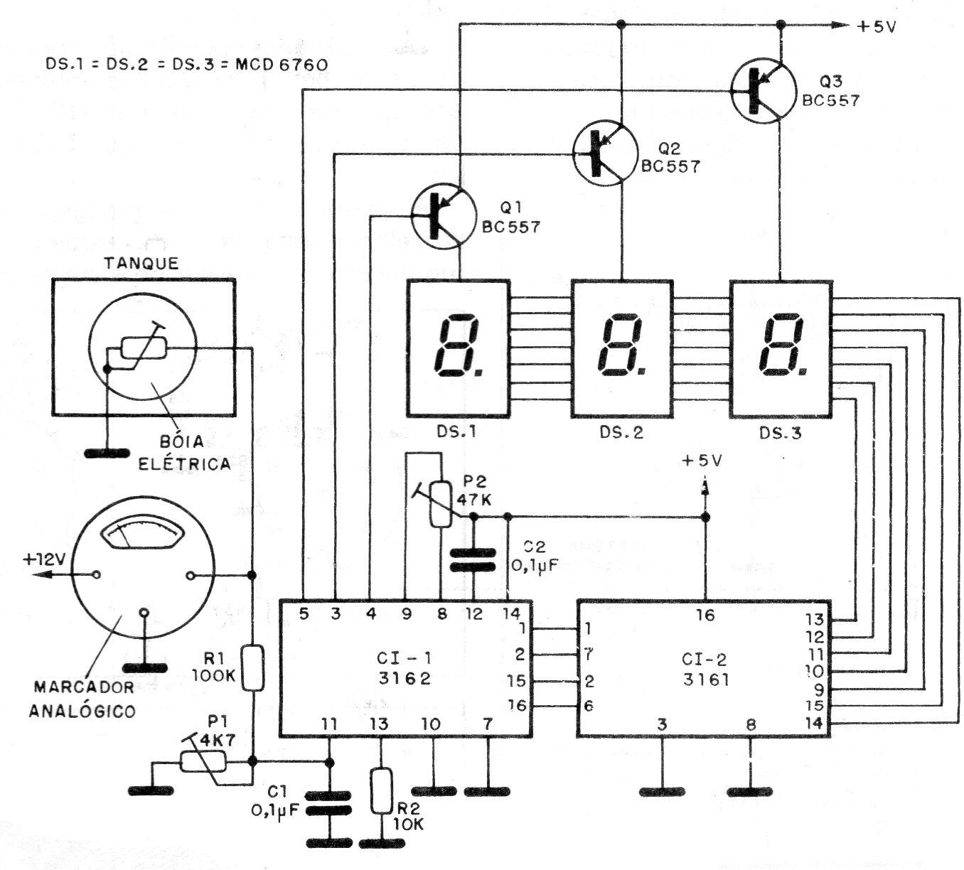 This circuit uses components that are no longer easily found. The circuit is from a 1988 documentation consisting of a 3-digit AD converter that can be used with a vehicle's fuel tank float sensor. The circuit is powered by the vehicle's 12 V and the displays are common anode.