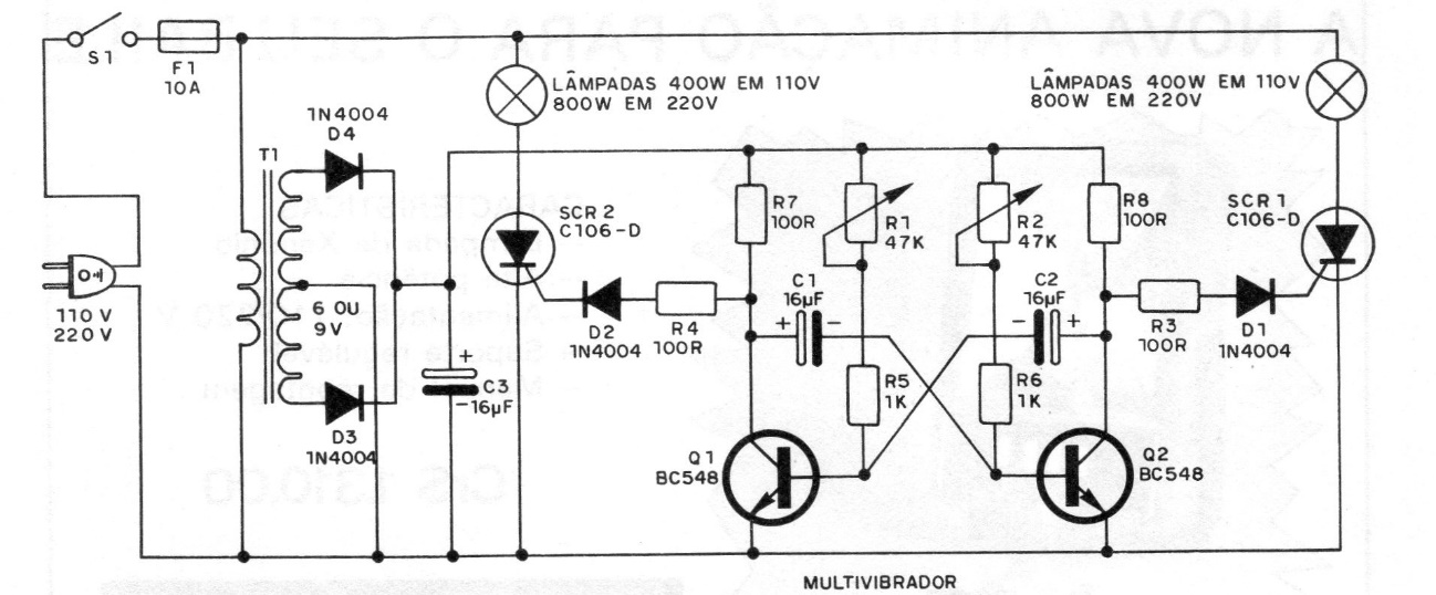 This circuit was obtained in a 1980 publication and was suggested for balls, parties, vehicles entering and leaving, Christmas tree, etc. The complete circuit is shown in the figure. It is an astable multivibrator formed by transistors Q1 and Q2 that alternately trigger two SCRs that can control loads of up to 400 W in each channel in the 110 V network and up to 800 W in the 220 V network. We have two parts to consider in this circuit: the low voltage part whose power comes from a transformer, and the high voltage part connected to the network that supplies the SCRs.