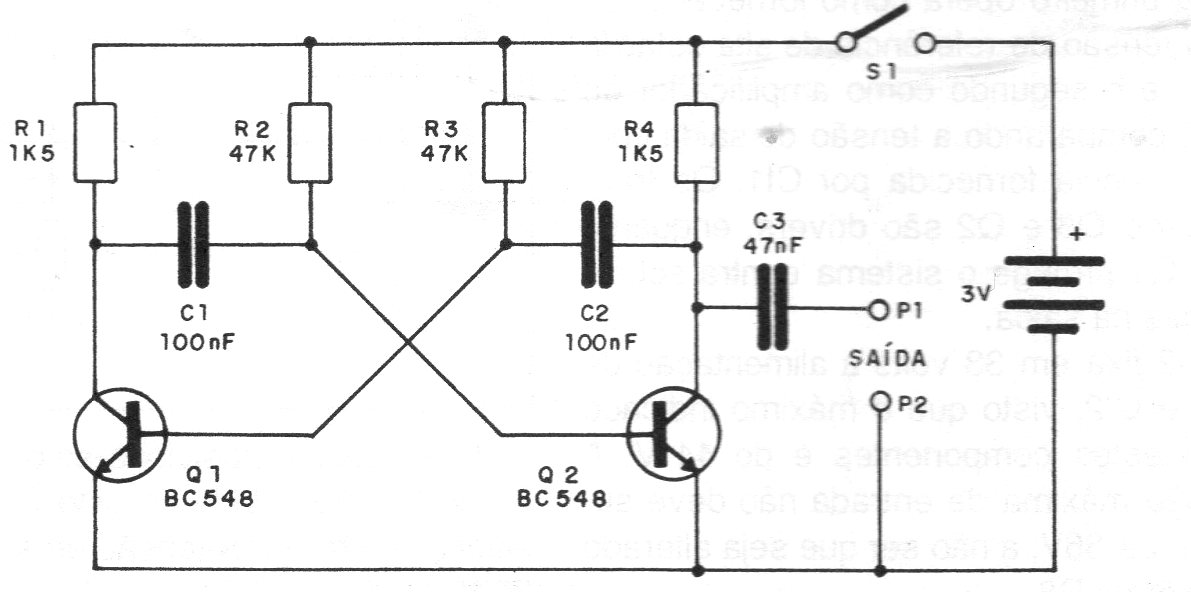 This astable multivibrator oscillates at a frequency of 1 kHz given by the capacitors and the base resistors. The signal is rectangular and powered by two small batteries. With the change of capacitors, the circuit can operate at other frequencies.