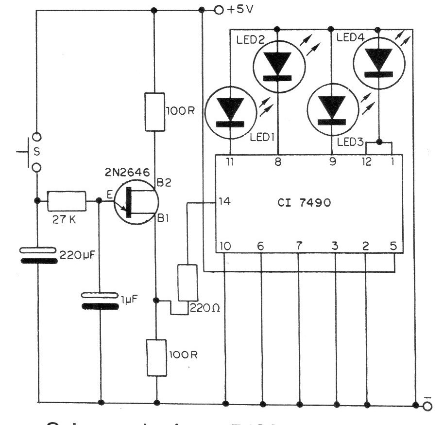 Here is a very simple and economical electronic game. Using only one integrated circuit and one transistor, this circuit makes the 4 LEDs light up in different combinations, which can be coded to be worth points. The circuit is shown in the figure and, as we can see, makes use of TTL technology. The integrated is a 7490 and the transistor is of the 2N2646 unijunction type. By pressing switch S, the 220 uF capacitor is charged with the supply voltage, then discharged via the oscillator formed by the transistor and the 1 uF capacitor. The oscillations of this circuit depend on this 1 uF capacitor, but its number is random, as it depends both on the time constant of the oscillator and on the pressing time of S, which cannot be easily controlled. The pulses produced are counted by the 7490, causing the LEDs to light up in a certain combination at the end. The interesting effect that this roulette produces is in the fact that the LEDs do not stop in the drawn combination as soon as the switch S is released, but later, given precisely by the 220 uF capacitor. Like all TTL circuits, the power supply must be made with voltages between 4.5 and 5.5 V, the ideal value being 5 V.