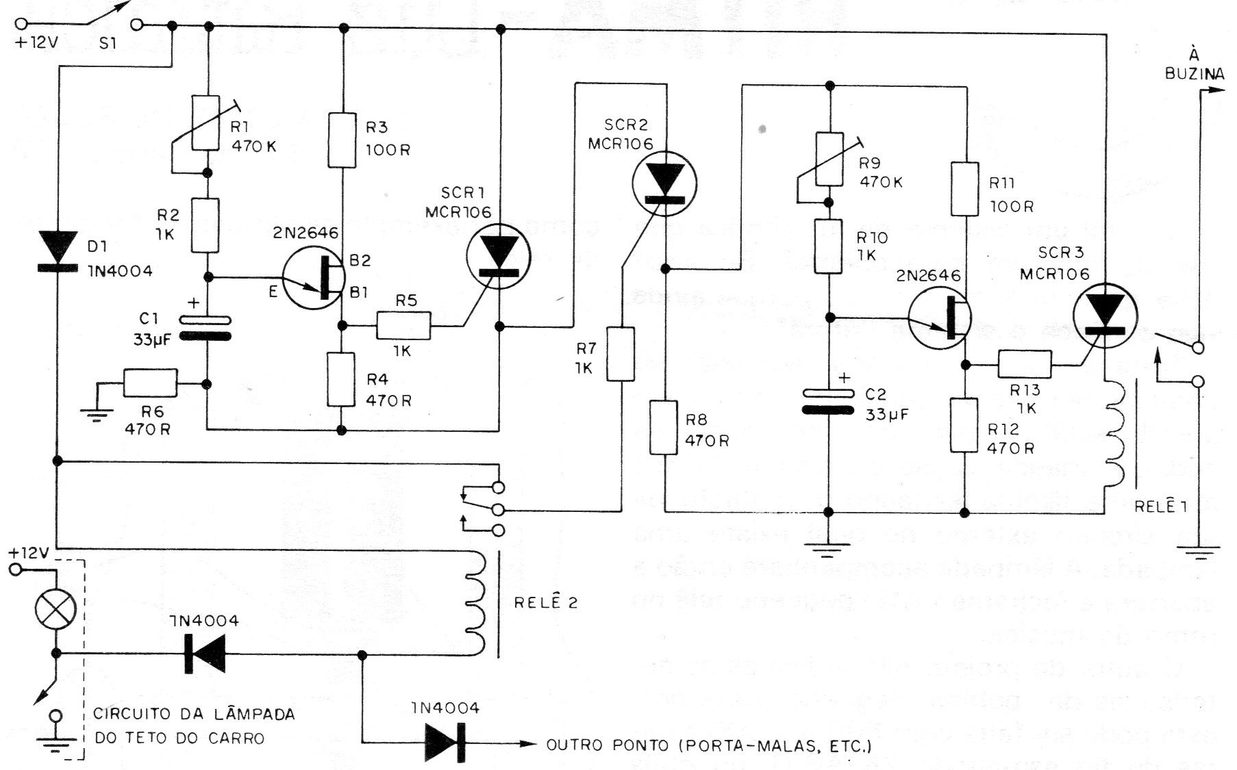 This circuit was obtained in a 1982 publication. There are many types of car alarms available to readers, each with specific characteristics, which mean better or worse performance. The choice of an alarm is difficult because the conditions under which the vehicle must be protected must be considered. The alarm we describe here, due to its characteristics, is undoubtedly one of the best and can meet the needs of the reader. Its operation is as follows: when leaving the car, the owner presses a switch (S1). With the activation of this switch, he has approximately 20 seconds to get out of the car and close the door. After that, the first oscillator emits a pulse that "sets" the alarm by triggering the SCR1. With the armed circuit a second waiting oscillator is placed in the circuit. If the door is opened now, this oscillator after 20 seconds will emit a pulse which will trigger the third SCR, which is the final link in the circuit, connected to the horn. These 20 seconds correspond to the time the owner must open the door and disable the alarm.