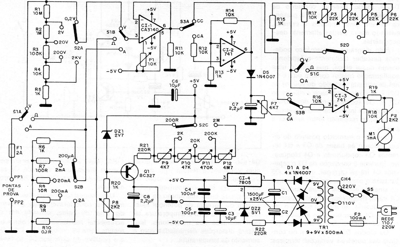 We found this electronic analog multimeter in a 1998 documentation. What sets it apart from ordinary analog multimeters is the high input impedance obtained thanks to the use of amplifier steps with operational amplifiers. The circuit includes a power source, and its accuracy will depend on the accuracy of the resistors used in the input splitter networks. The circuit has scales up to 2 kV for voltages and up to 2 A for currents. R10 must be wire wound type with at least 5 W dissipation.