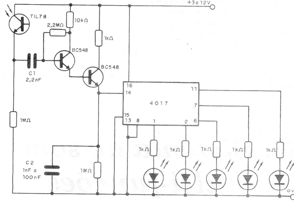 In fact, this 1992 circuit consists of a demonstration circuit of a 5-channel remote control that drives 5 LEDs in sequence. The figure shows both the transmitter and the receiver. For practical application, the LEDs can be replaced by relays. The circuits are powered by batteries and in the case of relays an external source must be used.