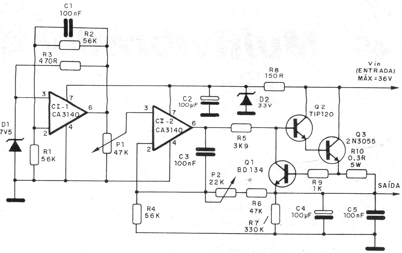 This circuit has a maximum output current of 5 A, and the 2N3055 must have an excellent heat sink. The reference adjustment is made in the trimpots and the components used must have voltages according to the circuit. The output voltage is 30 V, and the input voltage can be up to 40 V.